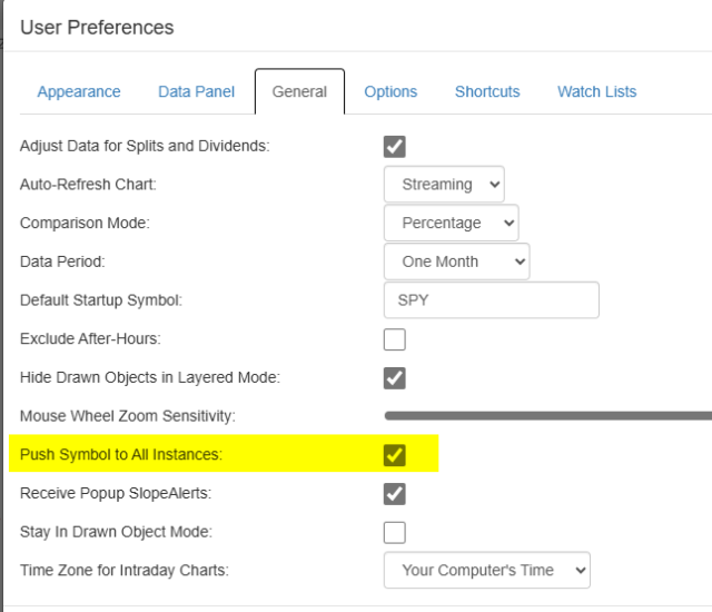We are pleased to announce the completion of a feature in SlopeCharts that people have been requesting for years: the ability to link all the instances of the chart so that when you enter a symbol in one, it gets populated to all of them. It doesn’t matter if they’re on different screens, different machines, or even different countries, any instance of SlopeCharts for your account will get the symbol “pushed” into it. A typical use case would be having different amounts of time presented on various charts.