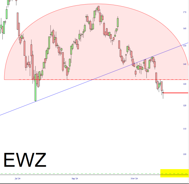 Although it might be short-term oversold (and its options absolutely stink) I am going to stick with my EWZ puts, since it’s a terrific pattern.