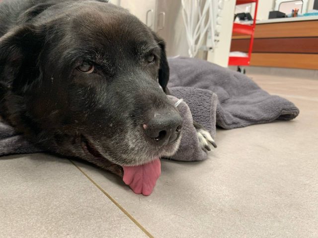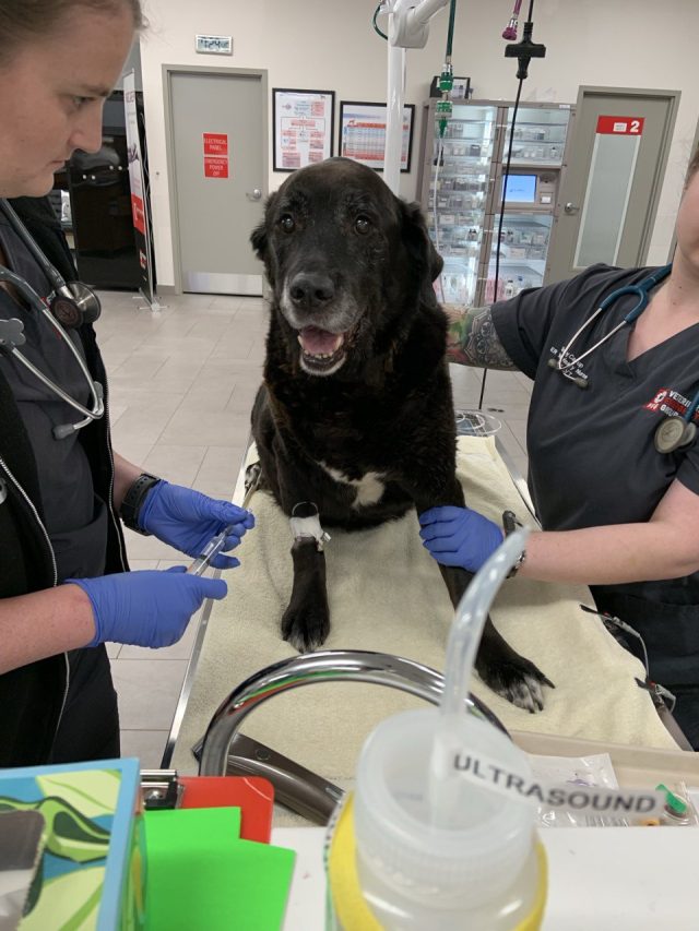 Over the course of two hours, the very kind staff there took immediate action. They shaved parts of her front leg, put in a catheter, sedated her, and shaved away parts of her torso so that they could insert a needle to suck out the fluid from her heart sac and her belly.