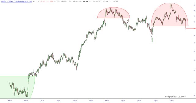Wow, check out the perfect head and shoulders top on UBER! These guys vaulted to a lifetime high on 10/11, the day after Elon’s “We Robot” event, but they’ve already lost 25% since then. This topping pattern makes their near-term future look even worse.