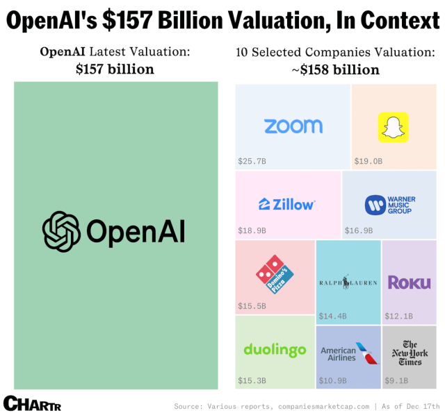 I am highly confident we are going to look back at this one day and shake our heads at the unchecked, white-men-in-coats insanity. Just look at all these household names and recognize that they are collectively worth less than a company which has never made a penny and instead loses tens of billions of dollars a year, thanks to investor funding.