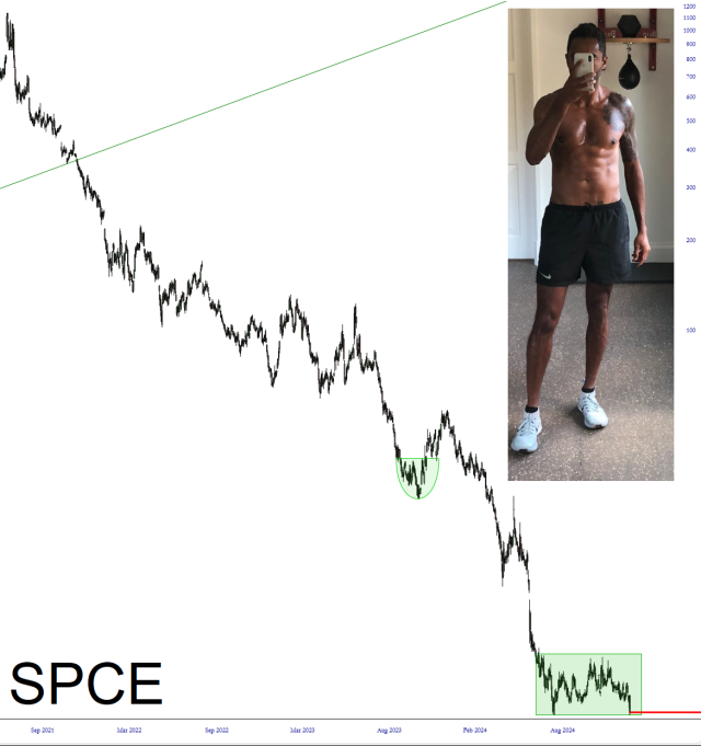 Hey, we haven’t peaked at Virgin Galactic (SPCE) in a while, have we? Remember that SPAC beauty that Chamath Palmididutgiuisdkwsjerke was pushing so hard? He got out at VASTLY higher prices, as if you needed to be told that. As for everyday people………..destroyed, as usual.