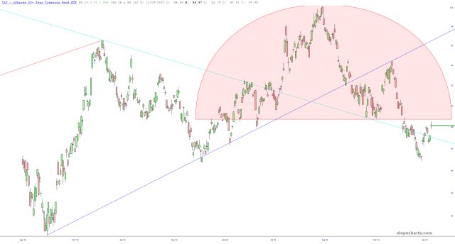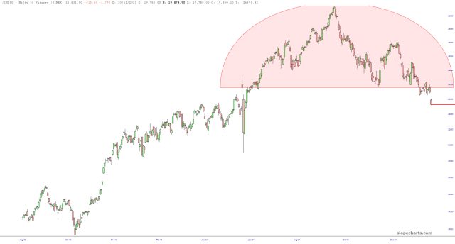 Evidently, there is a security (symbol /IND50 in SlopeCharts) representing the “Nifty 50” in Singapore. This is one of the cleanest looking H&S tops I’ve ever seen! Just thought I’d mention it, even though most of us don’t trade overseas.