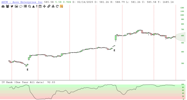 AXON is trading at $585.58, with a high IV rank. This presents an opportunity to place a bear call spread with a high probability of success.