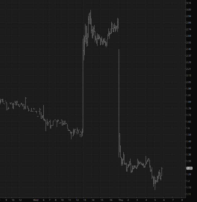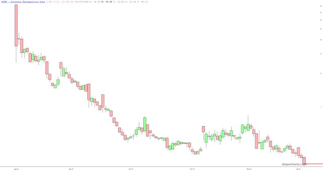 Well, don’t count your eggs until they’re in the pudding, because look at this morning’s chart. The entire gain has been laid waste, and the stock is now at lifetime lows. Why? Because the company wasted no time in announcing a new equity offering to take advantage of the price spike. I suspect management regrets this now, because they’ve instantly popped their own bubble, and the stock they sell will be at much cheaper prices.