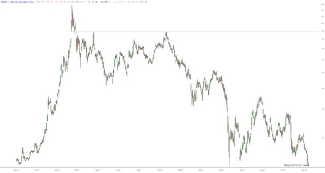 In spite of this slathering of political favoritism, BTC has been flopping around since before Thanksgiving in roughly the same range. What if this is as good as it gets? Let’s say BTC slides to, oh, nothing apocalyptic, but back into the $70,000s? That would crush almost all the profits that MSTR’s BTC holdings currently enjoy, and I daresay the stock would get kicked directly in the 1s and 0s, just like in did only two years ago when it lost about 90% of its value.