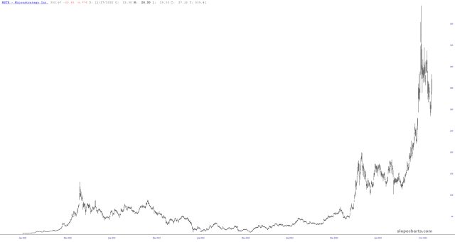 I do wonder, though………..what if BTC experiences another serious “risk off”? I’m not talking about a few hours or even a few days. But – – weeks or months. After all, the incoming federal administration is absolutely MANIC about crypto, pledging all kinds of stuff, including super-lax regulations, a crypto-friendly SEC, and, with the vast amount of spare cash the US has laying around, a big ol’ honkin’ sovereign wealth fund of Bitcoin just, ya know, because of strategy and whatnot.