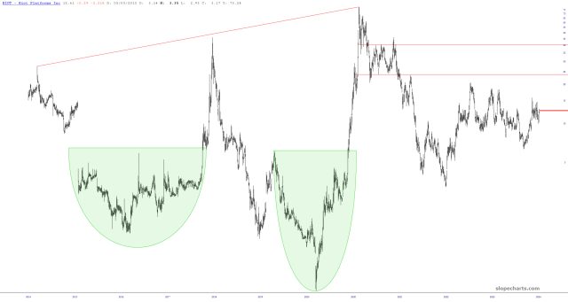 As we all know, Bitcoin (and crypto in general) has had an overall amazing success over the past ten years. Strangely, the equities that you would assume would have joined the party have just flopped around for years and years without really going anywhere, such as RIOT…….