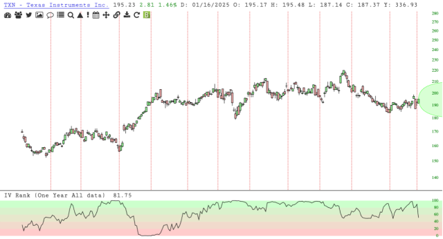 With TXN trading around $195.23, we find an opportunity as the company approaches its earnings announcement. Historical data shows that TXN typically moves within +/- 5% post-earnings—a useful guideline for setting up an iron condor.