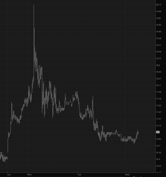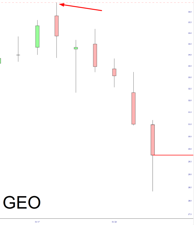 In that spirit, I’ve been quite interested in what I would call fading omnipotence. That is to say, going against the notion that the new POTUS has the powers of a monarch, which is how stocks in his orbit were being priced. For example, I bought June $40 puts on the private prison company Geo Group, and those are up 27% so far, because this sucker has fallen every single day since inauguration (marked with the red arrow, which is when I bought it).