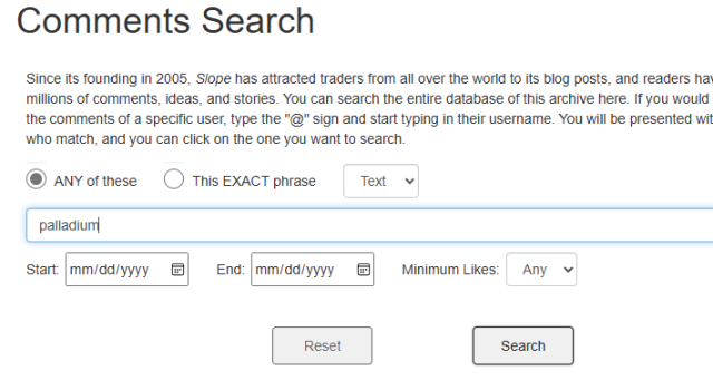 Given the lively conversation about palladium, I thought I’d remind folks of a handy feature here on Slope that lets you search the multi-million comment database.