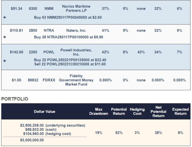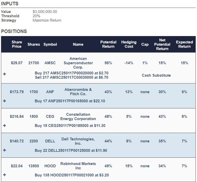 Here’s a portfolio our system created for an investor in July of last year. This was for an investor unwilling to risk a decline of more than 20% over the next 6 months. This one included American Superconductor (AMSC), Abercrombie & Fitch Co. (ANF), Constellation Energy Corporation (CEG), Dell Technologies, Inc. (DELL), Navios Maritime Partners LP (NMM), Natera, Inc. (NTRA), and Powell Industries, Inc. (POWL).