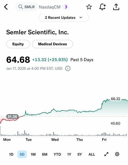 Semler Scientific closed at $64.68 on Friday, up nearly 26% on the week.