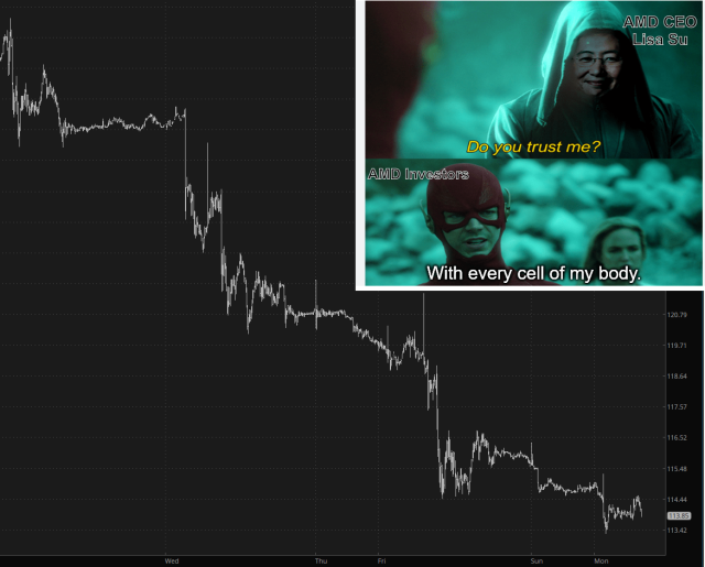 It’s also encouraging to see the semiconductor absurdity, which really peaked last July, continue to get firebombed. I am maintaining my long position on AMD puts (May $135). You may not know this, but there was a time that the elderly woman who runs AMD was a meme, much like Michael Saylor or Elon Musk. The fan-boys would create images like the one I’ve embedded below. Well, fellas, you’ve been done wrong.
