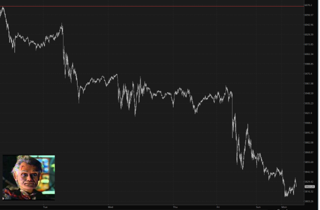 On a happier note, the erosion of stocks continues apace. Here’s the /ES over the past week. This is definitely the kind of market that I prefer: a slow erosion, as opposed to a mighty crash. The latter wakes politicians out of their stupor so they can trot out a new bailout. The frogs-boiling-in-a-pot situation works better for me, since I’d rather “set it and forget it” with respect to put positions.