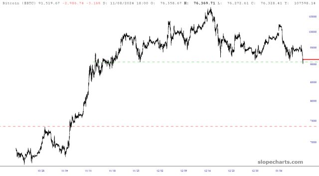 It’s particularly remarkable to me how swiftly the Trump Mega-Rally has been laid waste. The Russell 2000 futures, shown below, roared higher following the election and went on to reach its highest point in the thirteen-billion-year history of Earth. Within weeks, the entire rally was obliterated, and we are well below levels we were at when the election was still up in the air.