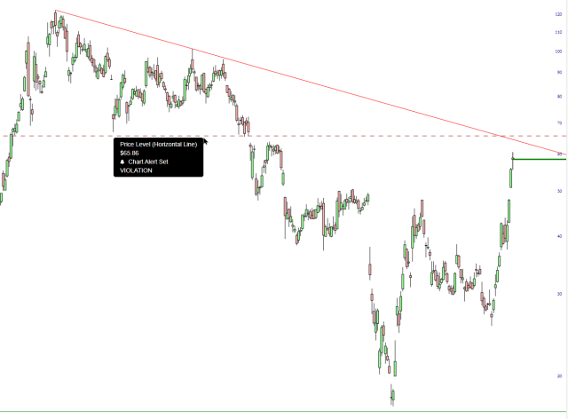 I have purchased August $67 puts on Super Micro Computer Inc. (SMCI, whose name sounds straight out of 1982). It has rallied about 200% over the past three months, largely out of joy that it isn’t going to get delisted (which was a real concern then). My view is that the gap at 65.86, as well as the descending triangle, make a formidable right triangle top, and that this obscene rise in price is close to an end. I might be a day or two early with this one, but that gap level is the key.
