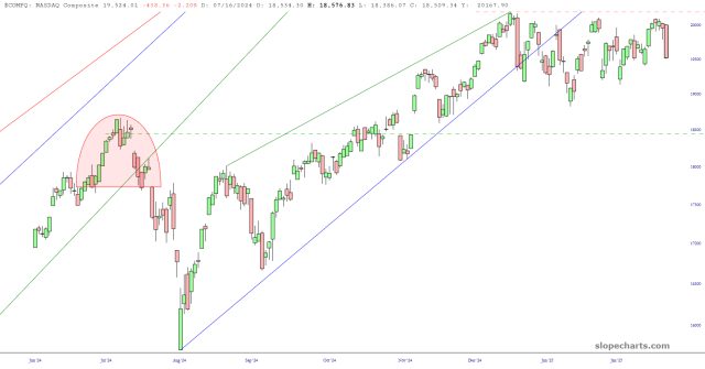 We begin with the NASDAQ Composite which, exactly in line with my Dancing Beneath the Ceiling post, saw its momentum wane and prices plunge. It’s funny seeing all the different mass media try to dream up a reason. One said it was tariffs. Another said a new Covid. Another said Trump in general. It honestly doesn’t matter.