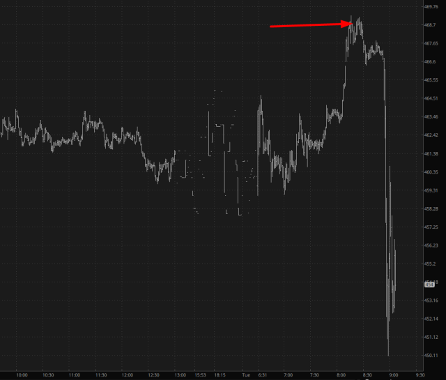 I’m delighted to report a rare instance of me not completely screwing up. You see, I am long puts in UNH, and they are up 90% so far. I came THIS close to take profits today (arrow) but slapped my hand away, because the stock hadn’t done anything wrong. There were all kinds of reasons in my head as to WHY I should get out, but, for once, I managed to control myself and stick with it. You can imagine my relief when, just minutes later, I saw this sucker plunging.