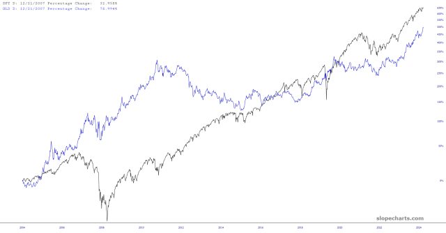 You can see this represented in the comparison below of gold (blue) and equities (black). They more-or-less move the same direction, and starting about half a decade ago, they are almost indistinguishable.