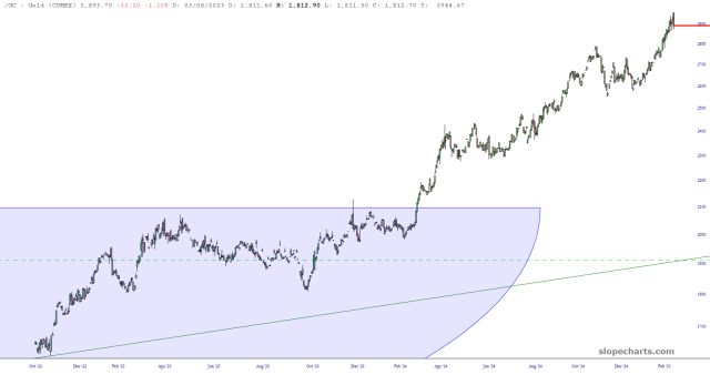 For one thing, silver is going to be at the mercy of gold (and indeed all financial assets), and gold isn’t exactly a bar-goon these days. On the contrary, gold’s launch to nearly $3000 has been almost uninterrupted, and it is way, way past due for a hard smack-down.
