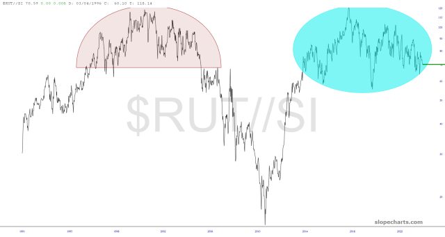 I know I’ve beaten the equity/precious metals ratio into the ground, but I can’t help myself, because the ratio charts are simply too amazing to ignore. In this instance, the small caps index (Russell 2000’s $RUT) divided by the long-term continuous contract of gold has completed a major reversal pattern, tinted in a lovely easter egg shade below.