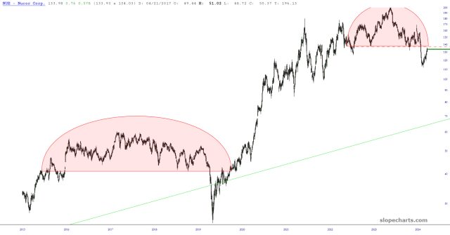 I did my first trade ever in Nuecor (NUE) today – – long puts (surprised?) – – September $140s. I like this H&S top!