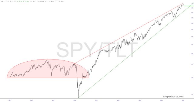 Stocks and bonds have an important, but ever-changing, relationship. It isn’t as simple as being inversely correlated. Far from it. Looking at the SPY/TLT ratio provides, I believe, an interesting pattern in the form of a rounded top followed by a wedge.
