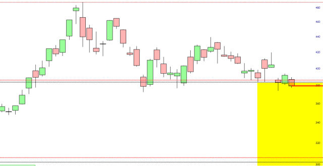 Worse yet, I would suggest that TSLA is teetering on the ledge of vitally important Fibonacci levels which, if broken, open up a clean path to almost $300, a tremendous fall from grace.