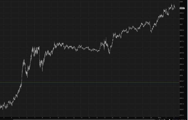 Oh, and as long as we’re rhyming, I’m also delighted to announce the “awesome blossom” of precious metals, as silver continues higher and gold, shown below, approaches $2900 for the first time in human history. Stocks down and precious up is what I’m all about!