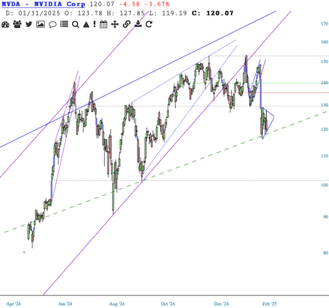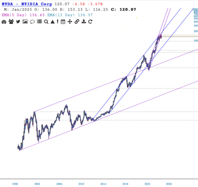 In 2024, going up against the top of the purple channel from 2022, NVDA tried, twice, but couldn’t stay up and out of it. That’s big deal number one.