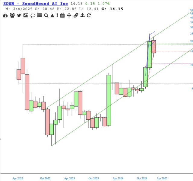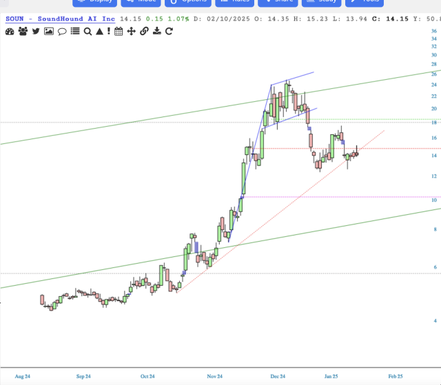 SOUN lost its chance for new highs when price broke down from a bearish rising flag in early January. Here we have another issue where price doesn’t make it past the resistance of a (green) channel top.