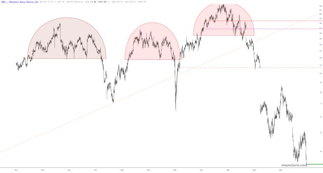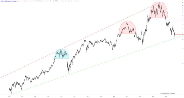 Albermarle (ALB) is a stock I suggested shorting in the autumn of 2023. It has been slow going, but it has ground its way down to its major trendline.