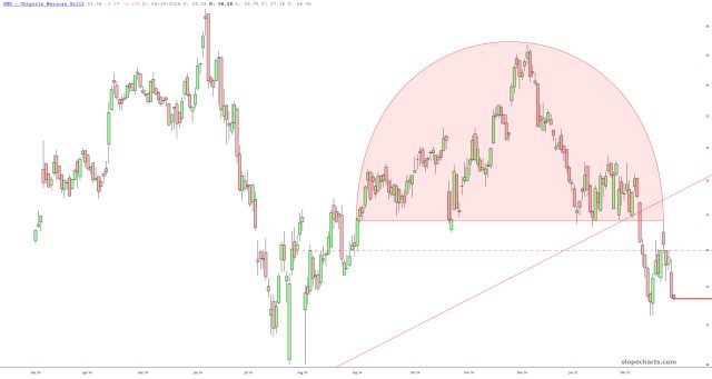 I’d like to raise an unopened bottle of cumin in celebration of the fall of Chipotle, which is a stock I used to treat like Kryptonite. After the recent trendline failure, I decided to give it a shot and bought September $60 puts. They’re up 50% already, and I’m anticipating much better returns.