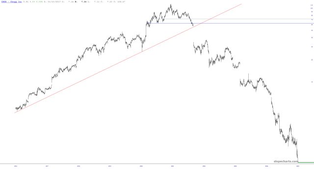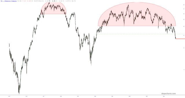 This is just a nice example of a class head & shoulders top, by way of the symbol CHGG. Chegg is a company that, last I heard, rents out textbooks to college students. It has fallen from about $112 to penny-stock land, and the H&S top preceded the entire move lower.