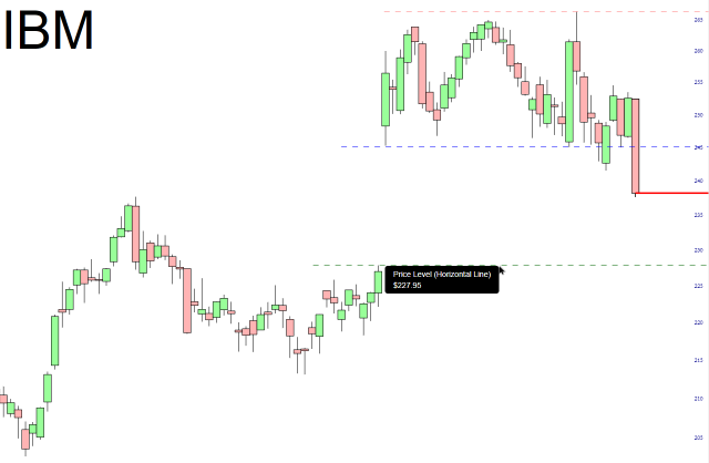International Business Machines was at the highest value of its 113 year history only a few days ago, but another support level has failed, setting it up for an easy move down to that price gap below.