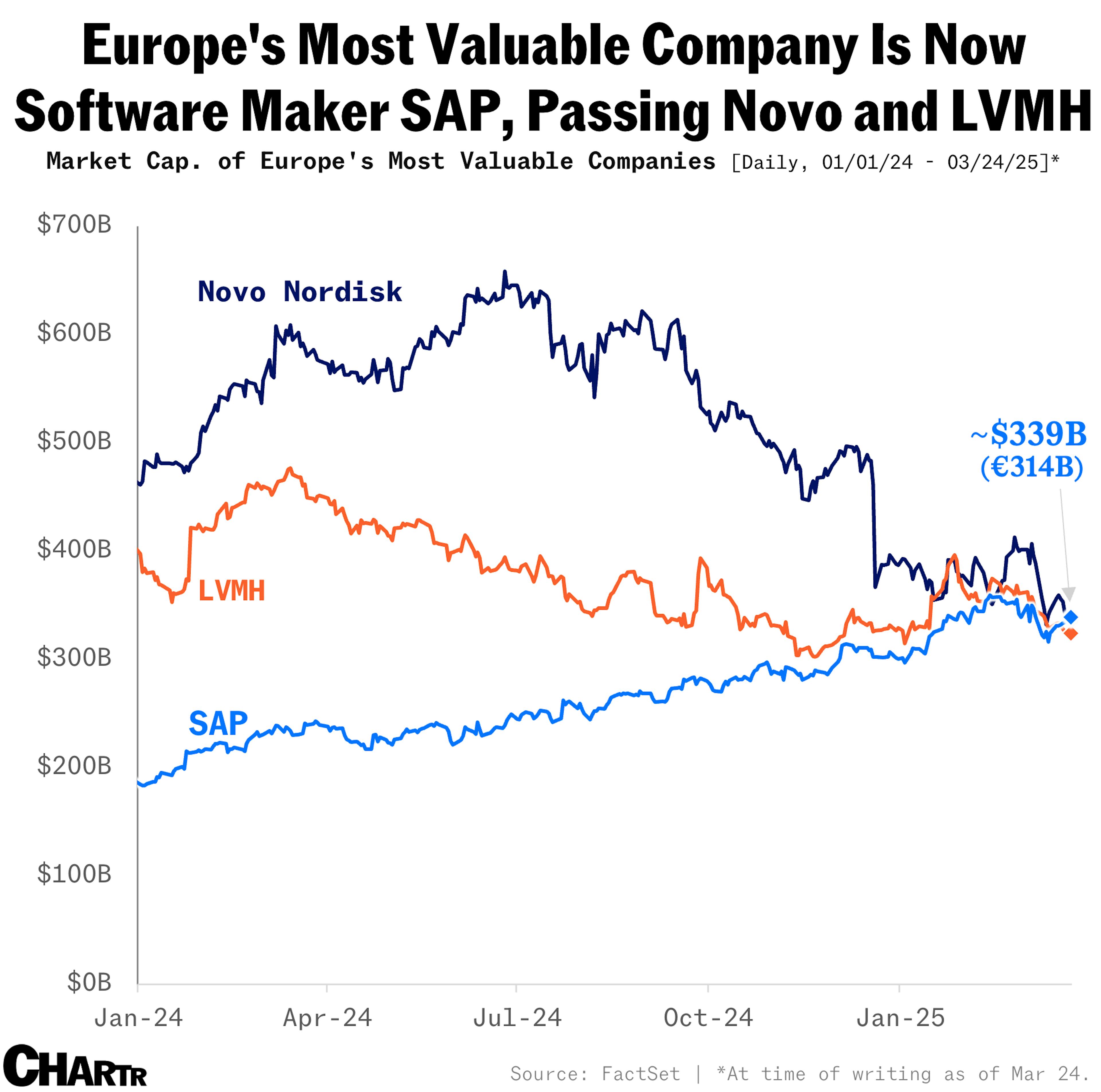 In Europe, the software maker SAP is now the top dog, surpassing drug pusher Novo and overpriced purse maker LVMH. All hail virtual assets!
