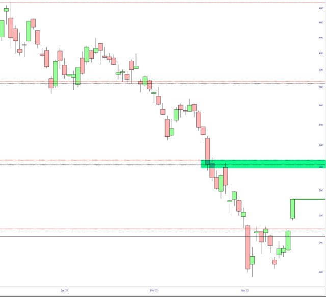 Tesla jumped about 10% this morning with a much-needed relief rally. Long-time readers know that I’m a Tesla fan, and I find the worldwide outrage, obnoxious posters, and, umm, lightning cars on fire to be insane (including the forthcoming 500 dealership protest five days from now). However, as a chartist, I think TSLA is going to slam the breaks around $300 or so, since the Fibonaccis are Tesla’s ruler.