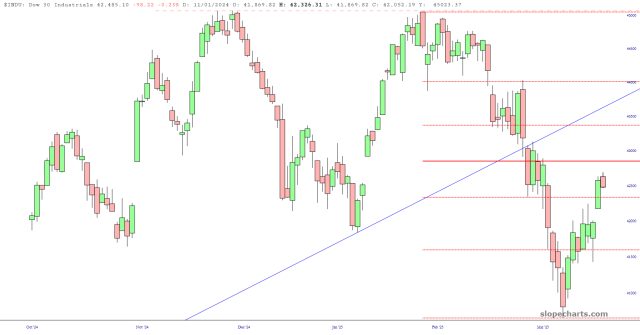 The only big event scheduled this week is the CPE on Friday, which is basically true inflation divide by three. Of course, your hero is really the main source for market movement, and that’s something which is decidedly unscheduled. Still, it is within the realm of possibility that the bounce is done or close to done, which surely will provoke more sneering remarks from the likes of Cougar, but I’m but only a humble chartist and share what I can, such as:
