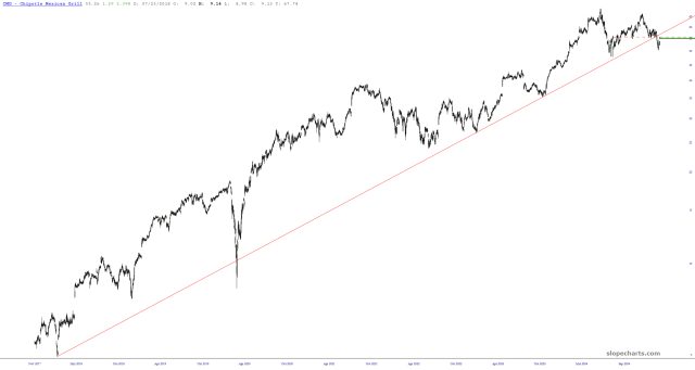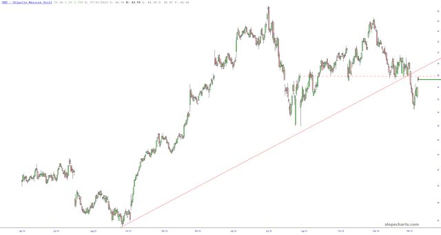 I’ve bought September $60 CMG puts, based on the broken trendline.