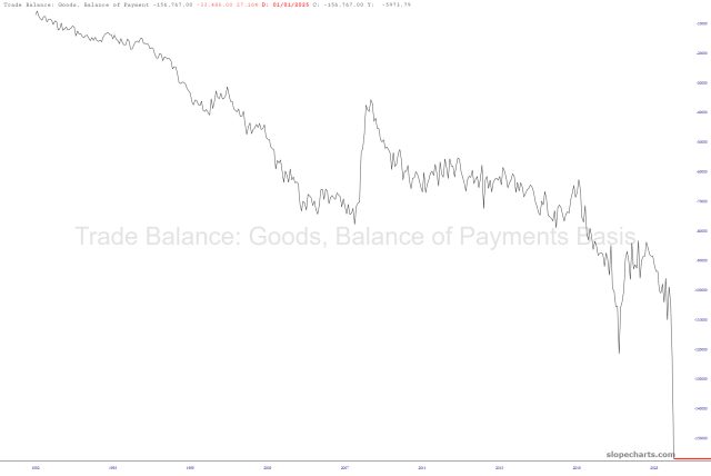 Speaking of lower, take a look at how the trade balance is going: a gargantuan price, just to borrow some words from your hero, “unlike anything we’ve ever seen before.” As he also might say, I suspect the recession ahead is going to be “very, very special.” Because third grade vocabulary.