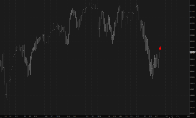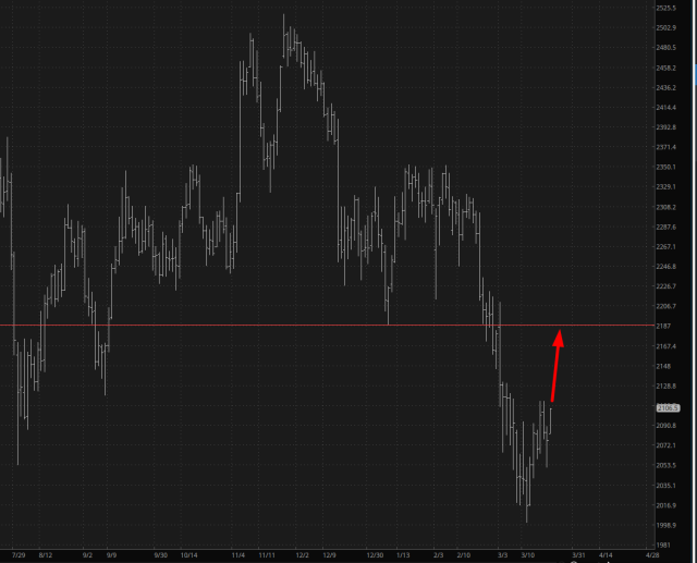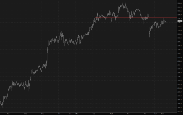 Thus, we are much closer to a much more plausible reversal point, which should (it had better!!) happen this week. This is the /ES, and the line I’ve drawn is the lowest major resistance point. In other words, it could legitimately be pushed a bit higher.