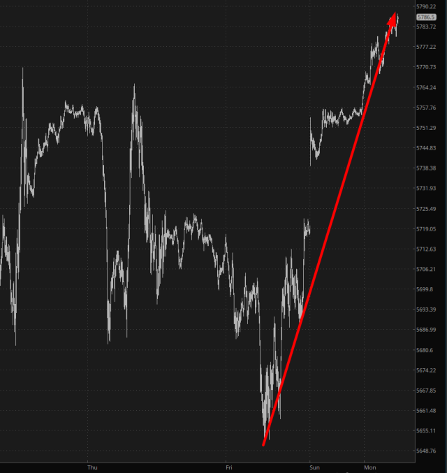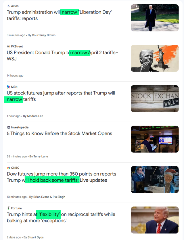 The reason? The administration flip-flopping, of course. We went through all this back during the first administration in which “Trade Talks Are Going Well” became nearly a daily joke. Back then, it was about the U.S. and China, but these days, it’s about the on-again, off-again tariffs. The latest volley is that the sweeping tariffs which ostensibly were going to bring in “trillions and trillions of dollars” (without it costing Americans a penny) are going to be narrowed substantially. Thus, the market is celebrating on this particular jerk in the opposite direction.