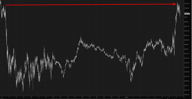 Over the past 24 hours, we’ve gone absolutely nowhere. The arrow below shows what has transpired between yesterday’s open and today’s on the /ES futures, which is a big fat zero. Now I suspect the market will be in a state of suspended animation until Powell announces the amazing news that interest rates will not be changed.