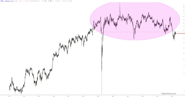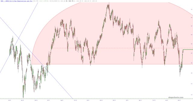 My energy positions (CNQ, COP, XOP) continue to cause pain, but I’m just gritting my teeth harder. XOP, below, is getting badly penetrated (and that image seems fitting) by price action, but my faith is in that morass of overhead supply slowing, stopping, and reversing this nonsense.
