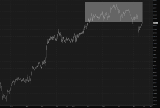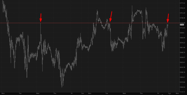 Over the past couple of weeks, though, as I’ve mentioned on almost a daily basis, it’s been an annoying grind-fest above and below 5725 on the /ES. On Friday, when it looked like we were finally starting to get some selling, the buyers came in for No Particular Reason ™ and pushed it, you guessed it, right back to the same line.