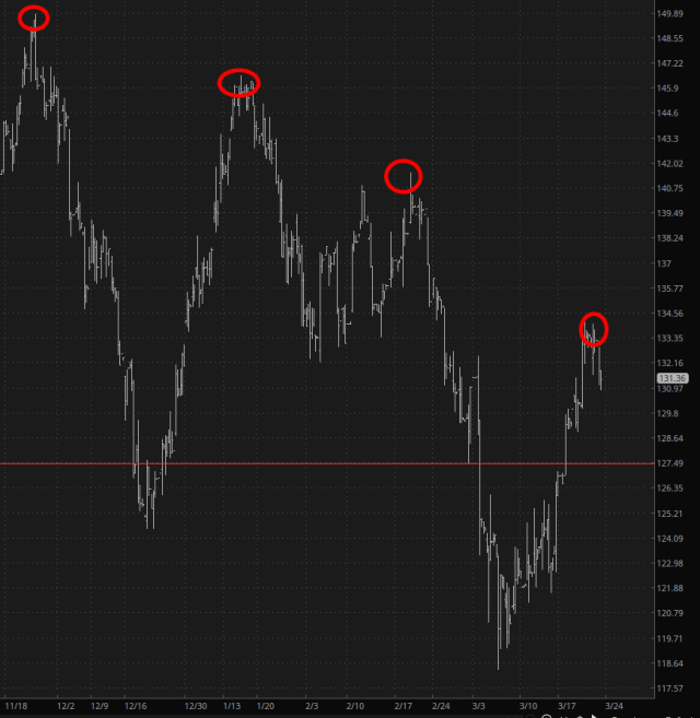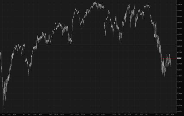 If you’re a bull, what should have happened many days ago is for the /ES to reach escape velocity and for the market to rip toward the much longer-term horizontal shown below. Instead, the market has utterly farted around.