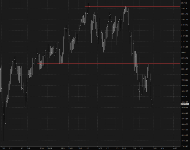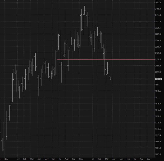 The weekly of the /RTY (as opposed to above’s daily) illustrates the magnitude of the potential drop.