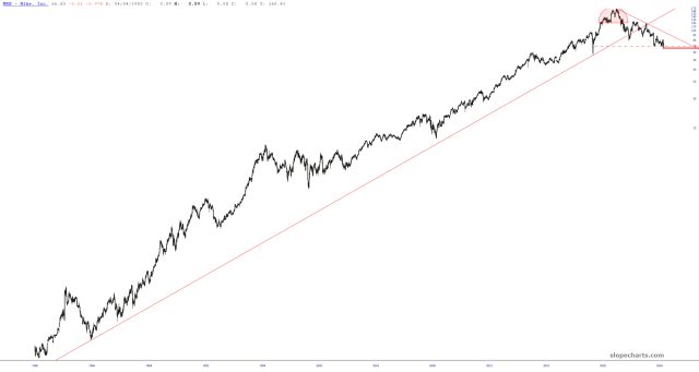 Nike steadily tracked higher since Jimmy Carter was President. The long-term trend is broken, and I’d say Nike has many years of losses ahead.