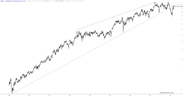 Mondelez (MDLZ) was up today (which makes it a freak), so I shorted a huge block of it. That broken trendline is just what the bear doctor ordered.